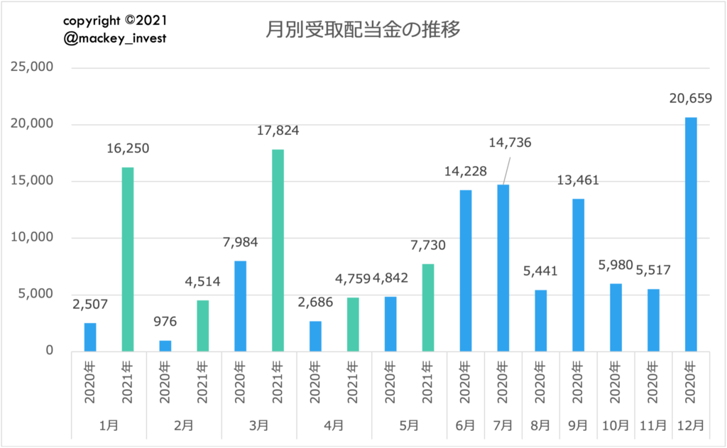 昨年2020年の5月の受取金は4,842円でした。今年は7,730円ですから、1.6倍ということになります。これはもちろん、主に2020年中の買い入れによるものです。まだ増配の影響は軽微だと思います。