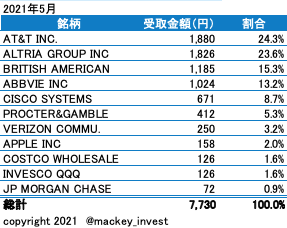 早速結論から。2021年5月の受取配当金は、7,730円でした。今月は、全て米国株(ADR含)からの受取です。